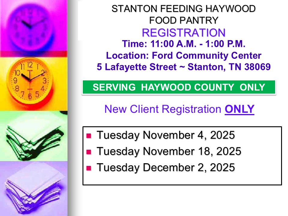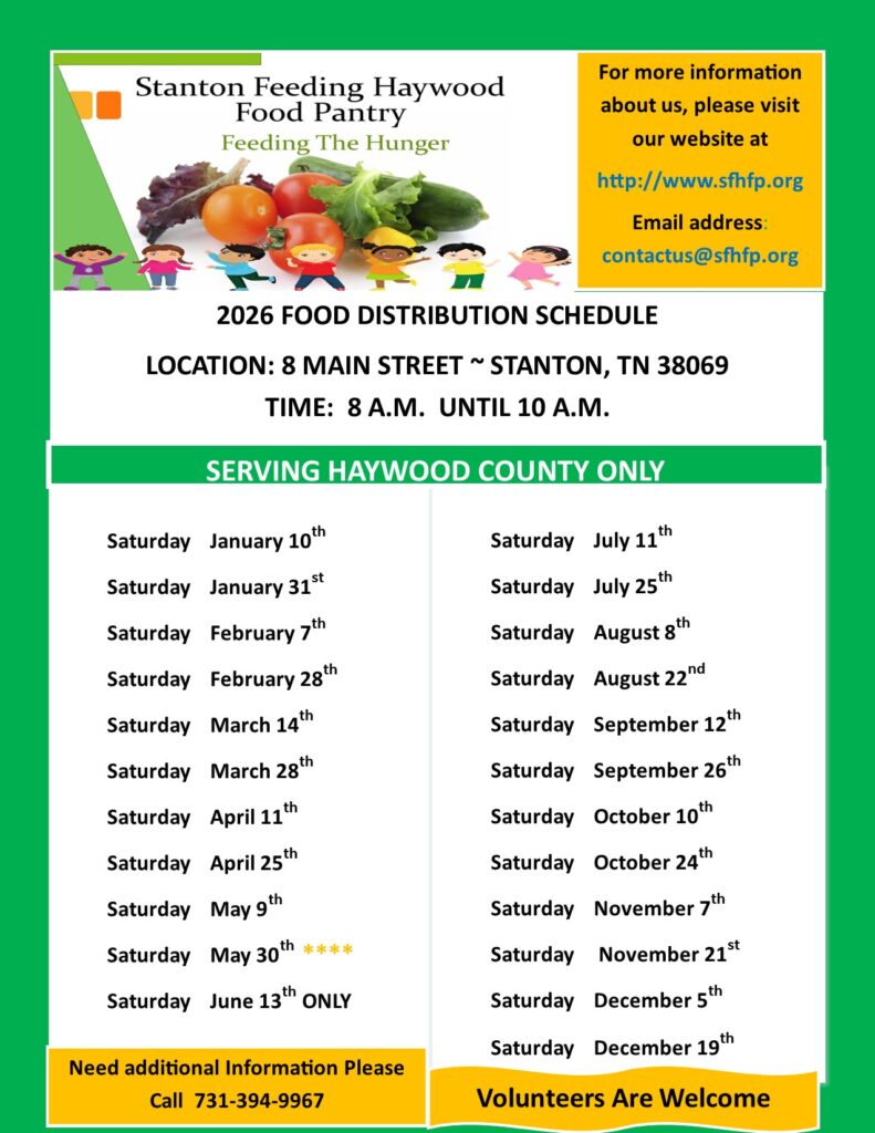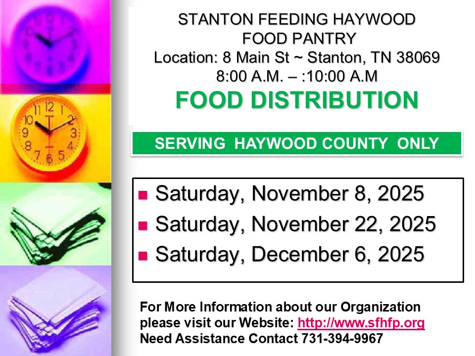 Stanton Feeding Haywood Food Pantry [SFHFP] Association was formed May 24th, 2016 and it’s sole purpose is to care and feed the hunger. Stanton Feeding Haywood Food Pantry will operate a charitable food pantry as an independent, non-profit Association to serve those who need food assistance in Haywood County in the city of Stanton, Tennessee. Currently we are providing food for Haywood County Residents ONLY.
