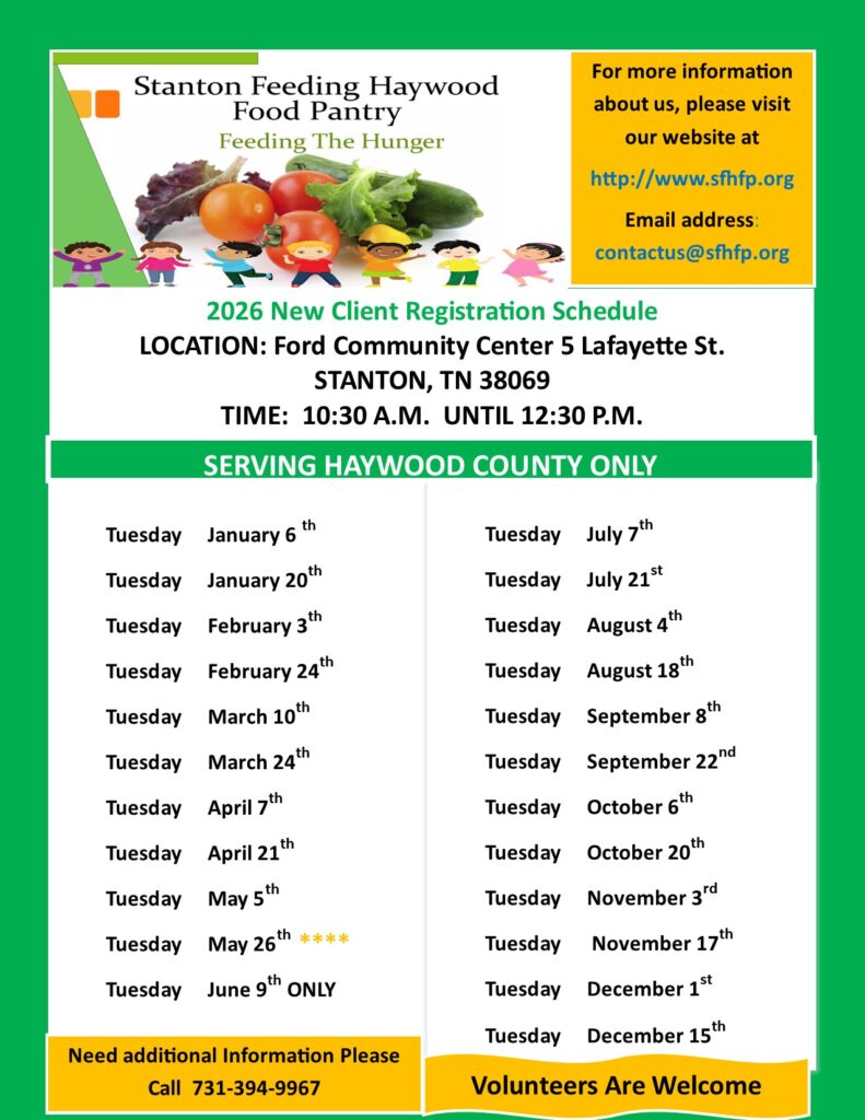 Our Schedule for Client Registration and Mid-South Food Distribution: